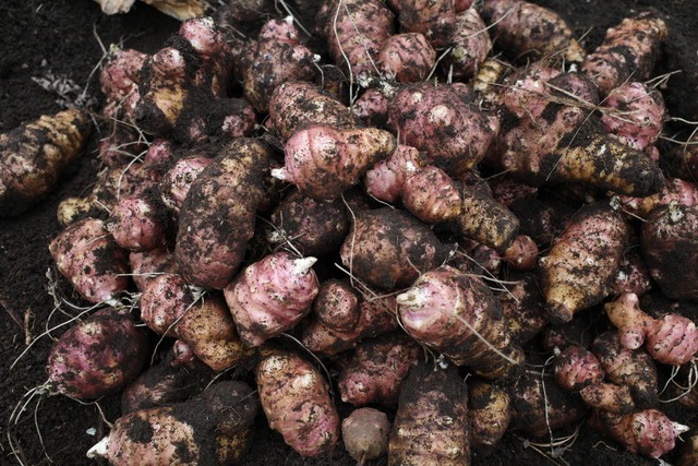 自然栽培、無施肥、無農薬、13年目の畑で育てた紫菊芋です。掘ったままの状態でお送りします。 タネ芋にも使えます。 紫菊芋は、「天然のインシュリン」と呼ばれる「イヌリン」を菊芋以上に、豊富に含みます。 じゃがいもと違い、芽に毒性はなく、皮もそのまま食べられます。 植え時期:4月~ 間隔:25~30cm 覆土:5cm 量:「宅急便コンパクトBOX」に入る分だけ詰め込みます。菊芋の形状により、約1kg。 (その他ダンボールサイズ詰めなど、ご希望ございましたら、別途お問い合わせよりどうぞ) 菊芋フライ、きんぴら、甘酢漬け、泡菜にして保存食など。 里芋やジャガイモ代わりに煮物にしてもOK。 カロリーはじゃがいもの半分以下。